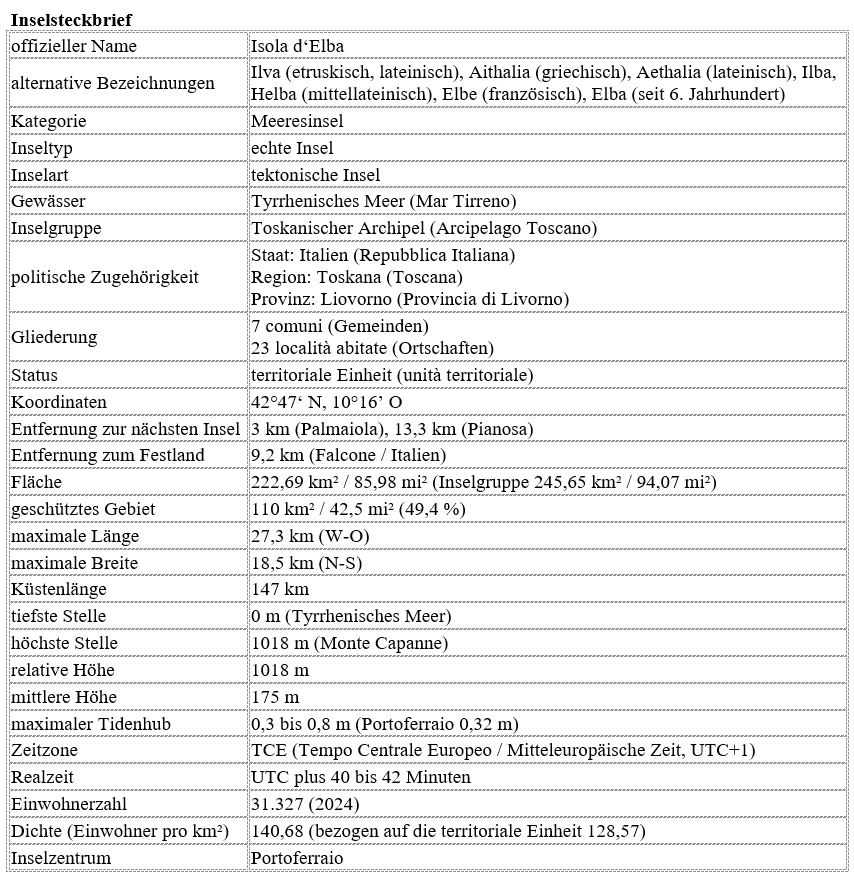 [[Datei:Elba - Inselsteckbrief.png|rechts]] | [[Datei:Elba - Inselsteckbrief 2024.png|rechts]] | ||