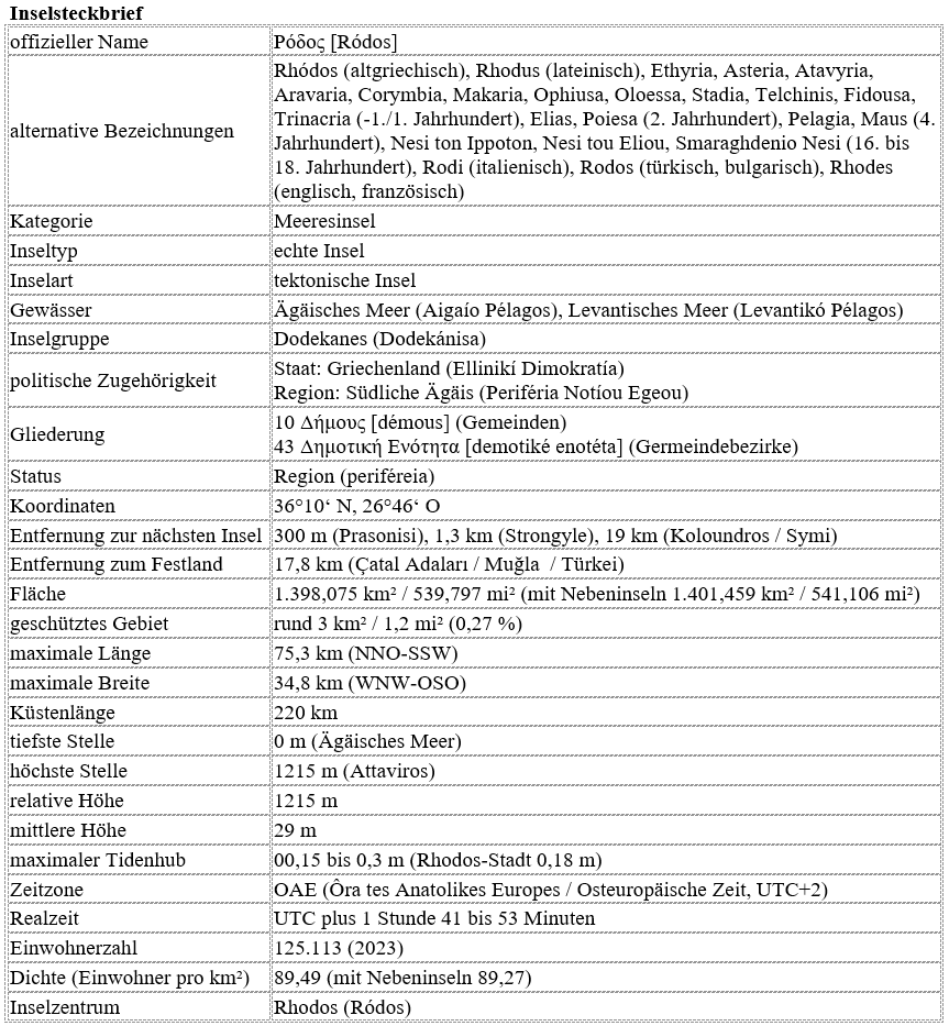 * Bezeichnung der Bewohner: Ρόδιοι [Ródioi] (Rhodier) | * Bezeichnung der Bewohner: Ρόδιοι [Ródioi] (Rhodier) | ||
