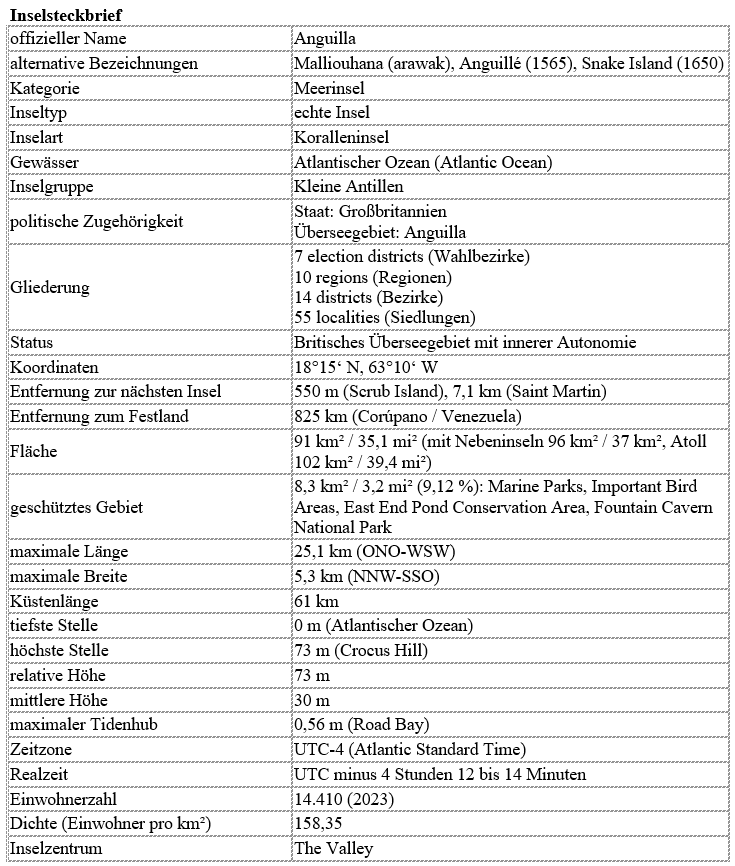 Anguilla, östlich von Puerto Rico am Rande der karibischen Inselwelt gelegen, ist eine Inseln über dem Winde im Bereich der Kleinen Antillen. Politisch ist das Eiland, zu dem administrativ auch einige kleinere Koralleninseln gehören, ein Überseegebiet des Vereinigten Königreichs von Großbritannien und Nordirland. In den späten 1960er Jahren erlebte Anguilla eine kurzzeitige Unabhängigkeit, die so gut funktionierte, dass sich das Mutterland dazu veranlasst sah, der Sache militärisch ein Ende zu setzen. Aus dem solcherart zerstörten Erfolgsprojekt eines autarken Ministaats wurde in der Folgezeit eine Steueroase und ein Urlaubsparadies für "Superreiche". Der Traum vom eigenstaatlichen "Small Is Beautiful" lebt nur noch in wehmütiger Aufmüpfigkeit weiter, während neuerdings der Hype um die "Künstliche Intelligenz" bzw. "Artificial Intelligence" in Form der bei einschlägigen Unternehmen begehrten inseleigenen Internet-Domain ".ai" Millionen an Dollar ins Land spült.