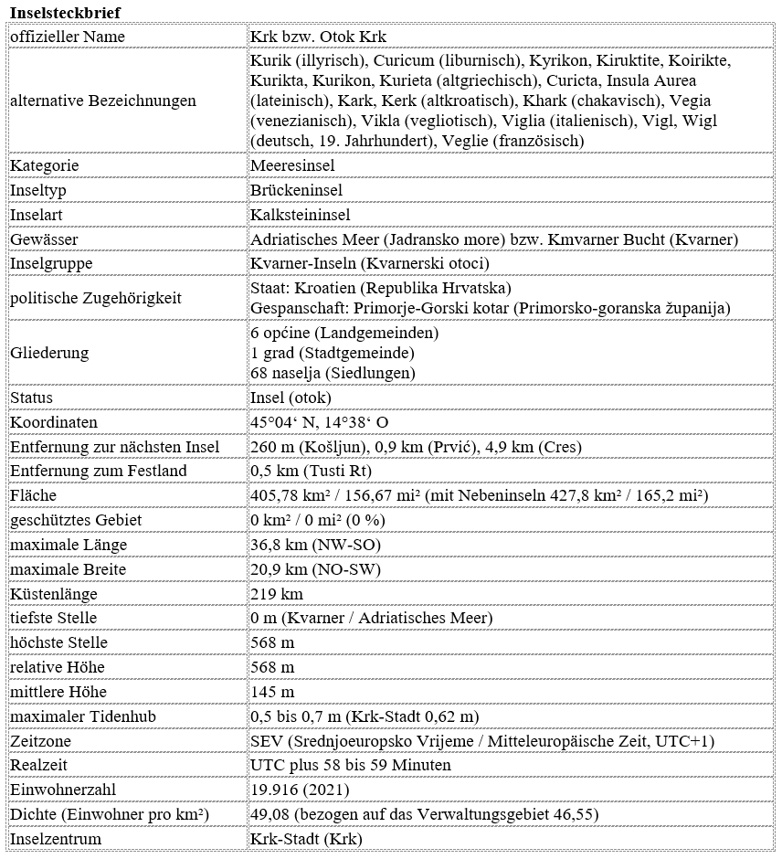 Krk ist die größte Insel Kroatiens, obwohl es eigentlich keine wirkliche Insel ist, seit es eine Landverbindung per Brücke gibt. Außerdem ist hier der Flughafen der Großstadt Rijeka mit direkter Stadtanbindung. Nichtsdestotrotz zeichnet sich die Insel durch ihre vielfältige Natur, zahlreiche historische Orte und ein breites Freizeitangebot aus und gilt als beliebtes, familienfreundliches Urlaubsziel mit besonderem Augenmerk auf Umweltschutz.